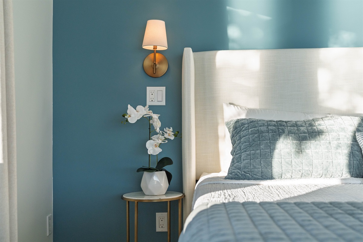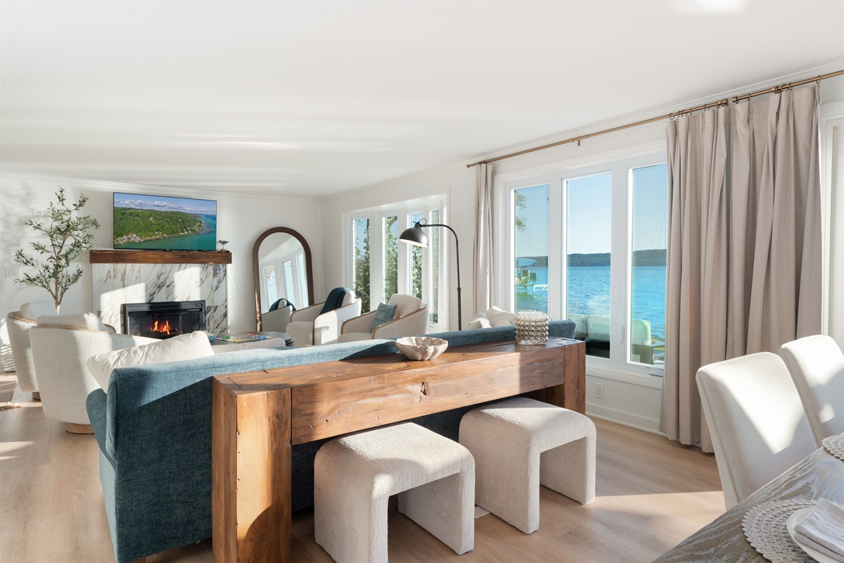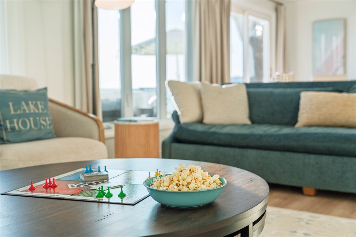 The inviting living area encourages slow mornings and long conversations. Curl up by the electric fireplace, stream your favorite shows on the Smart TV, or enjoy a game night as waves lap the shore. Every space is designed to make you feel right at home — modern, welcoming, and filled with light.