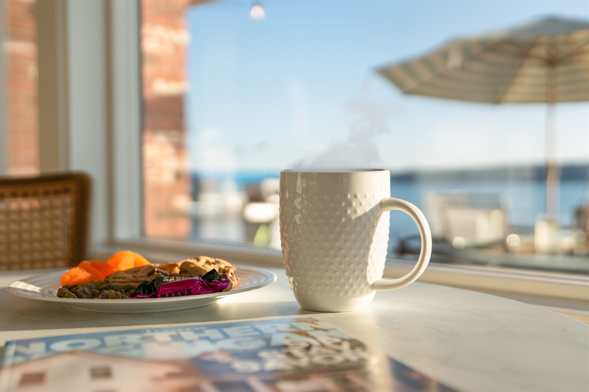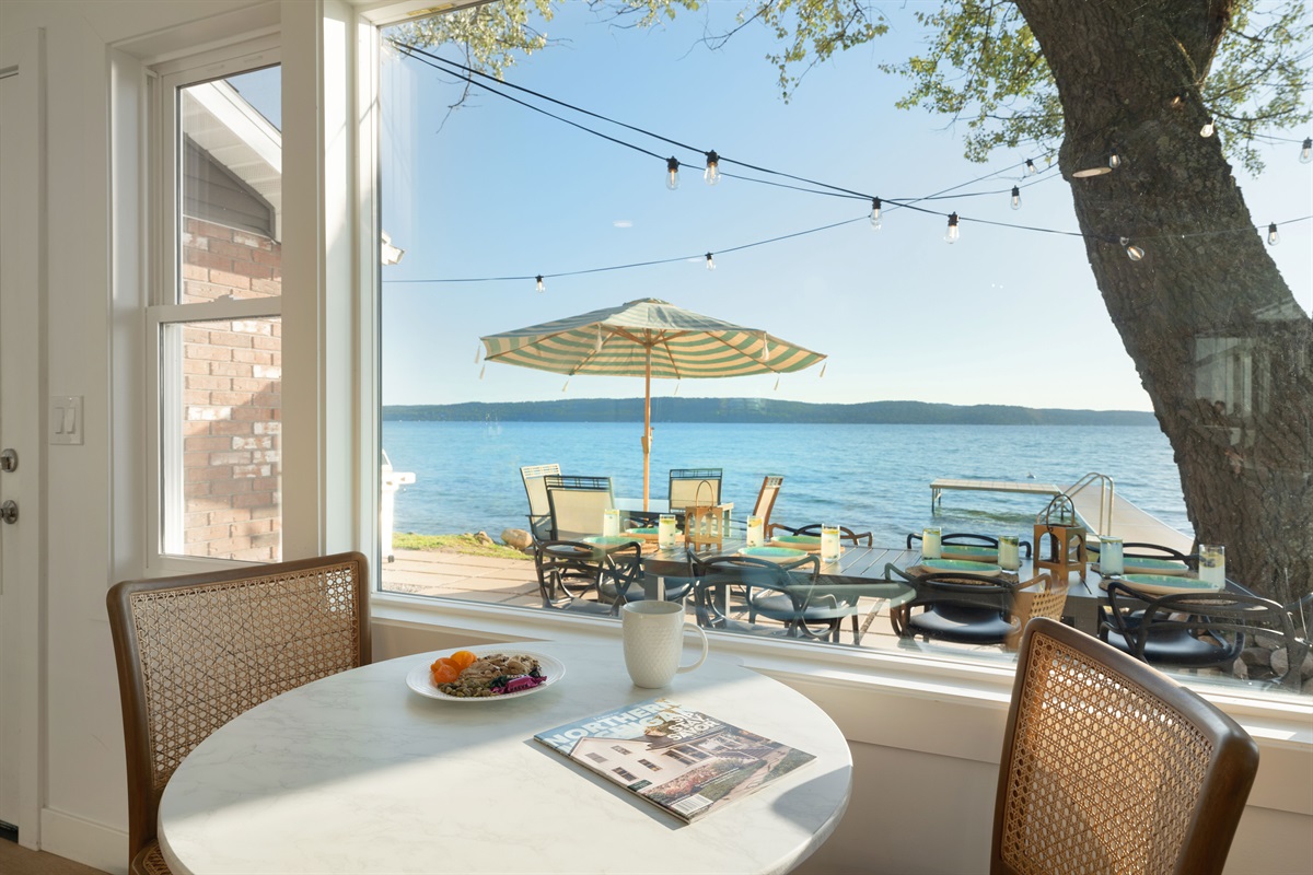 The newly renovated chef’s kitchen was built for connection — featuring a large island, 36-inch stove, coffee/tea station, and panoramic lake views. A private chef is available year-round for gourmet dinners right at home. Share meals at the spacious dining table for 8, or sip coffee from the window seat as the morning sun reflects on the lake.